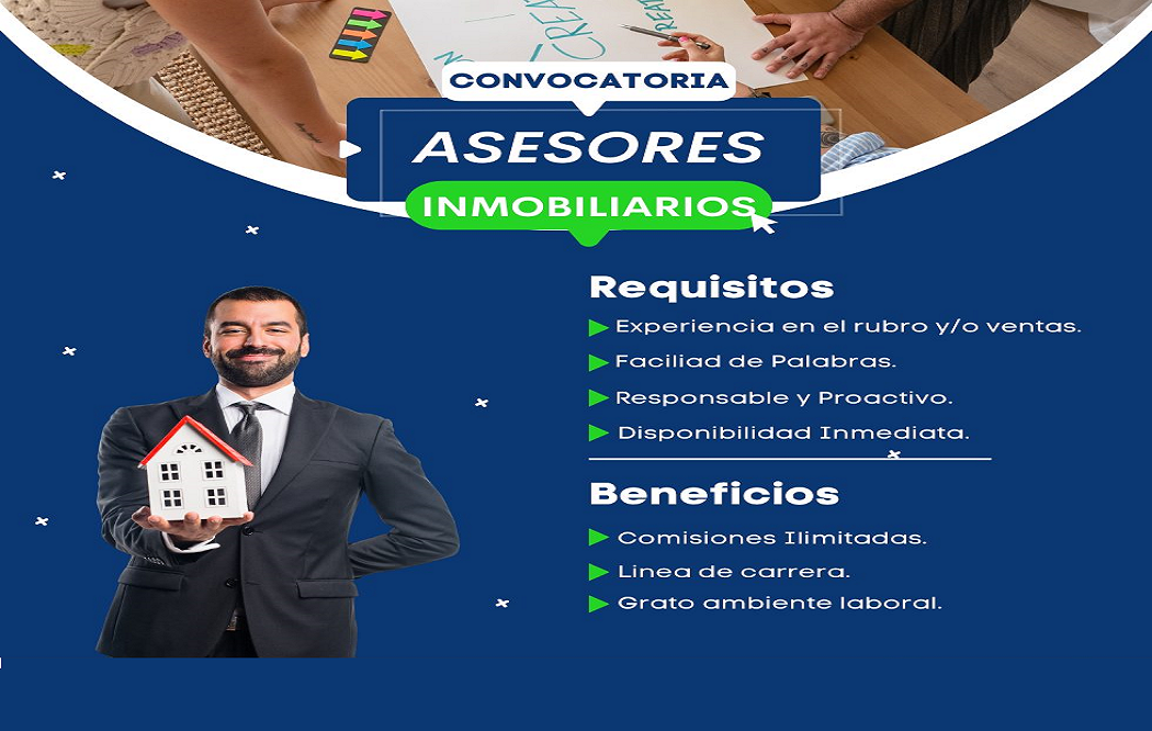 ¡Únete a nuestro equipo en el sector inmobiliario! Si tienes experiencia en ventas, conocimientos en el mercado y estás listo para nuevos desafíos, queremos conocerte. Ofrecemos un entorno de trabajo dinámico, capacitación continua y oportunidades de crecimiento. ¡Postula«AQUÍ» ahora y forma parte de una empresa en expansión!